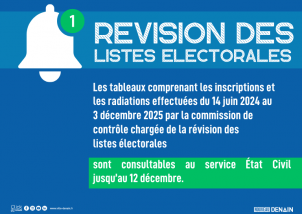 La municipalité informe les administrés que les tableaux recensant l’ensemble des inscriptions et radiations réalisées entre le 14 juin 2024 et 3 décembre 2025 par la commission de contrôle chargée de la révision des listes électorales sont désormais mis à disposition du public.